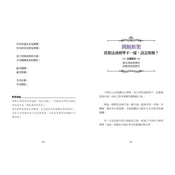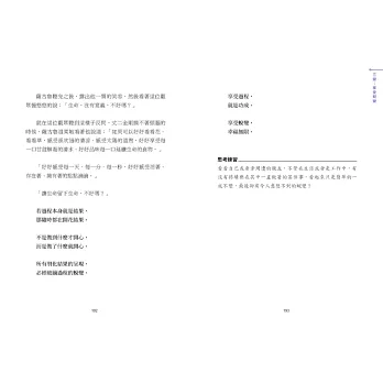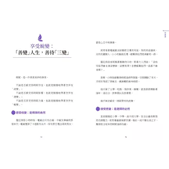 「若過程本身就是結果,那隨時都在開花結果。不是做到什麼才開心,而是做了什麼就開心。所有羽化結果的呈現,必經破繭過程的蛻變。」──摘自第25篇〈享受蛻變〉